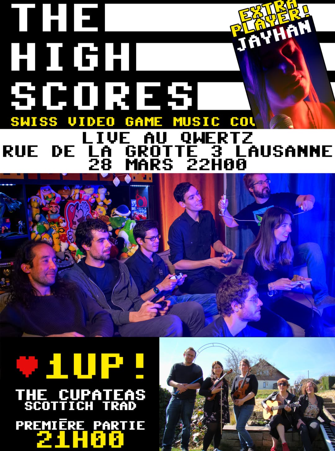 Fondé en 2019 à Renens, The High Scores est un groupe de musique dont le répertoire est composé exclusivement de reprises funk/rock/pop de musiques de jeux vidéo. Les membres du groupe ont pour but de jouer la musique des jeux vidéo de leur jeunesse, dont les mélodies intemporelles avaient imprégné leurs esprits, et qui les renvoient – même aujourd’hui – à des souvenirs de missions en terres magiques, dans des galaxies lointaines…